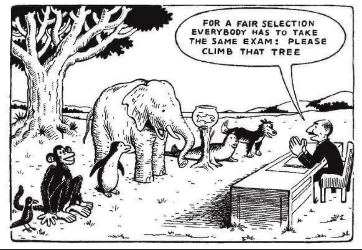 The idea is that what’s easy for some (aka, asking a monkey to climb a tree) is not doable for others (like an elephant, fish, or a penguin). Part of being a good teacher is recognizing your student’s strengths and weaknesses and adjusting accordingly.