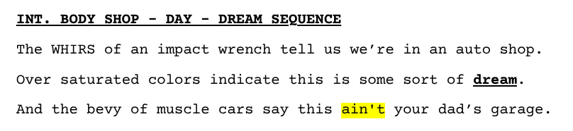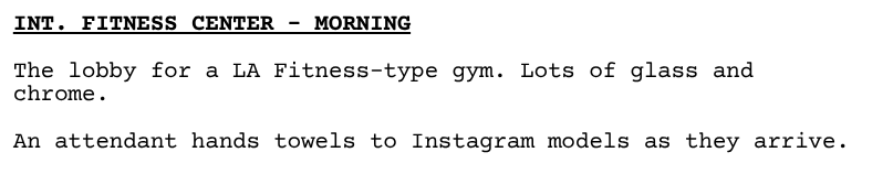 What makes this hard, though, is script format. Frankly, this thing sucks for writers. The blank spaces, the margins, the indents … A simple scene with just two characters talking can easily become 10+ pages if you aren’t careful. And in a 100-page script, that’s 10% of your total runtime! Egads!