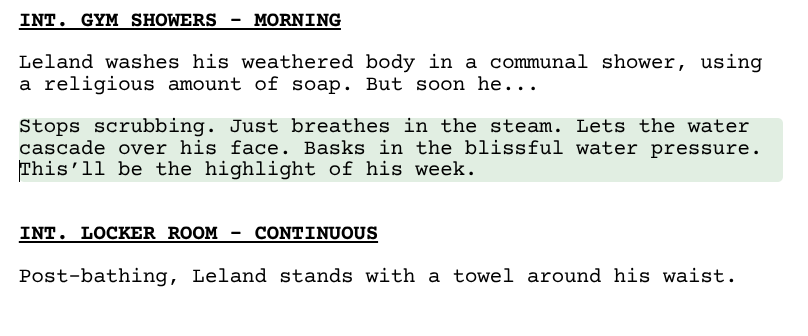 You make a killer trade. You just took away one line from the top page, which moved the scene heading up. And in return, you got at least 2 lines back (though it’s more like 2.5 lines with how scene headings are formatted.
