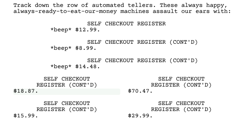 In this script I wrote a few years ago, I wanted the sound of the self-checkout registers to be overwhelming. To come in quick succession and bombard the reader for thematic impact.